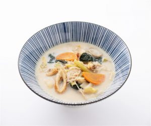 豆乳と鶏ガラのまろやかな熱々スープに、豚肉やあさり、白菜やちくわなどの具材をたっぷりと。
